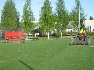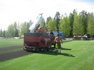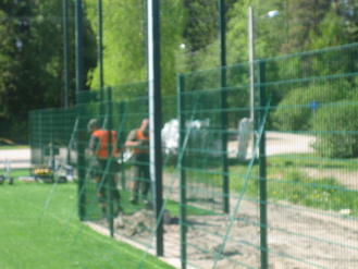 ![]() Kumirouhe viimeistelee kentän jouston | ![]() Lopuksi aita ympärille |